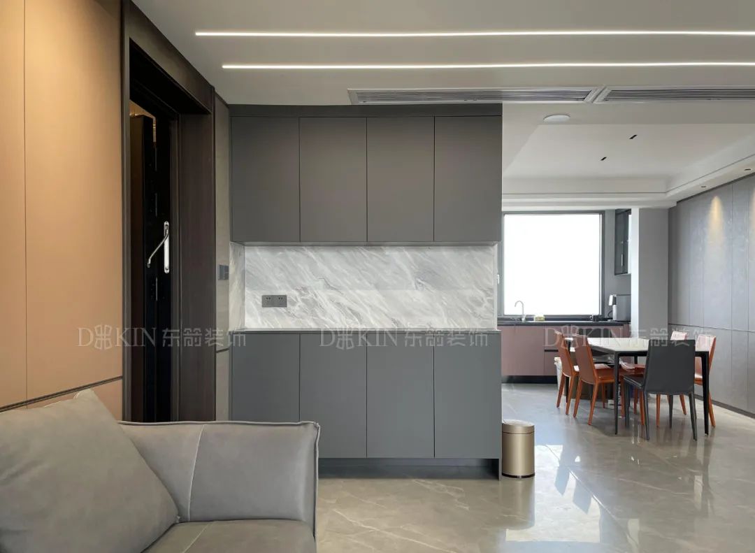 餐厅空间保持自然质感采用了黑白灰风格,水吧台增添实用性和休闲设计感,让家里变得温馨起来。