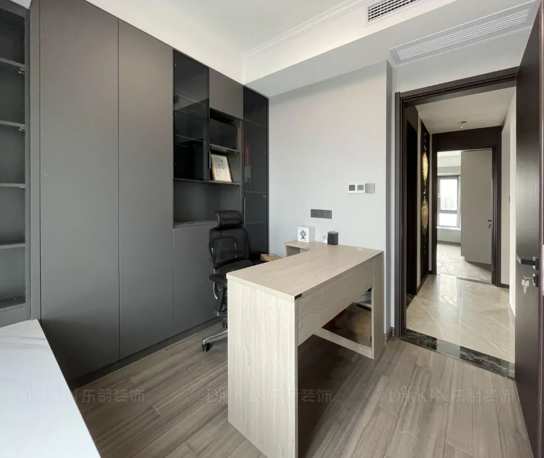 定制书桌和书柜满足办公和阅读需求,灰色搭配也增加了空间设计感和实用性。